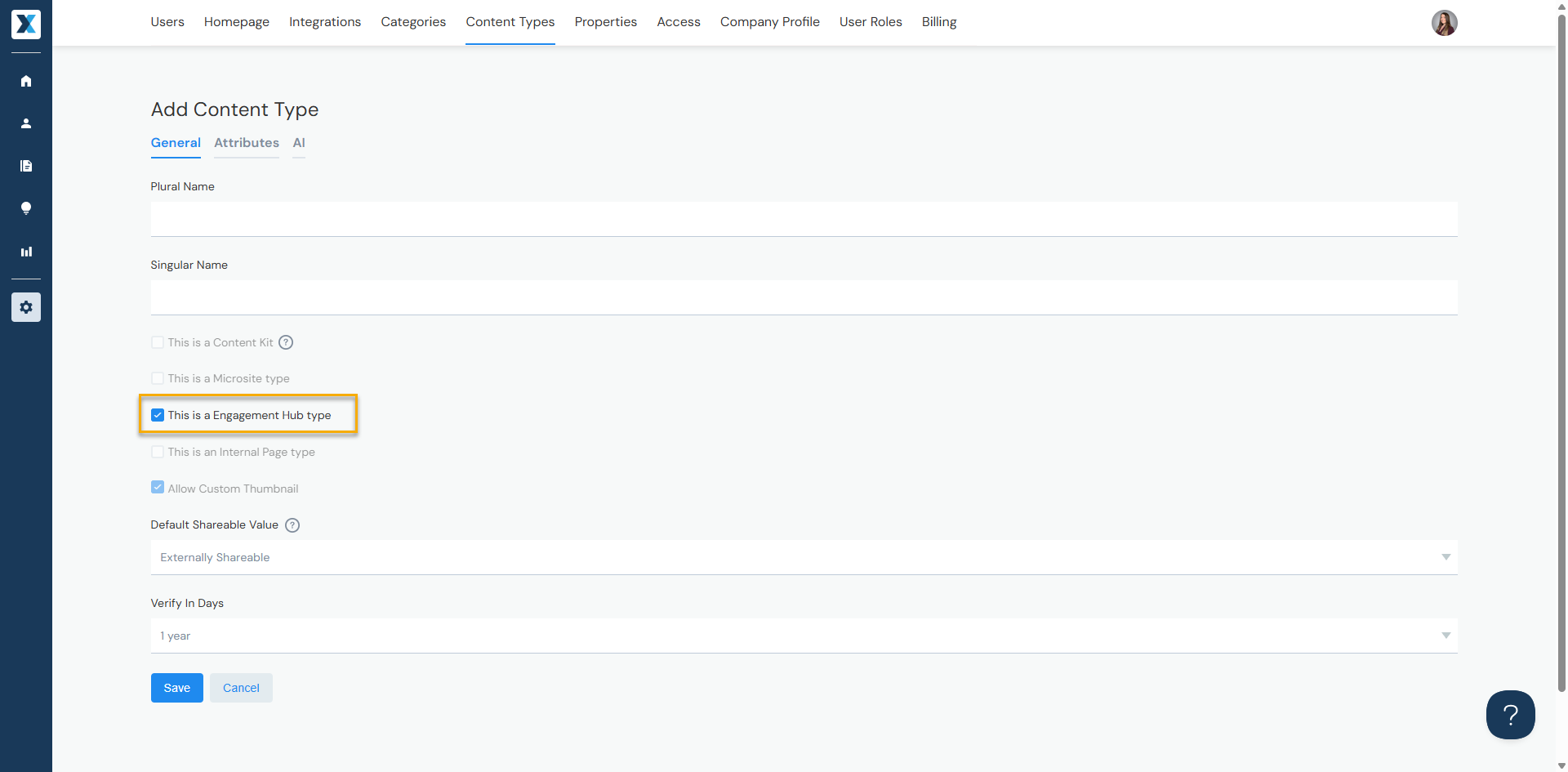 Administrators can add, modify, and delete Content Types from Company Settings > Content Types. When adding a new Content Type, check "This is an Engagement Hub" to enable Engagement Hub functionality.