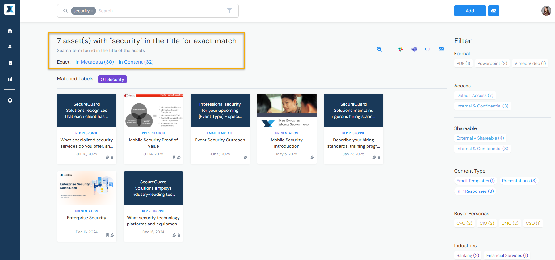 Narrow down your search results using the filters on the right. You can filter by shareable value (externally shareable or internal & confidential), categories, labels, and more: