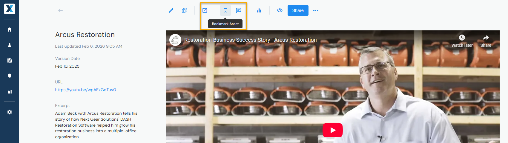 Receive an email notification each time when content you've bookmarked gets updated or deleted. To bookmark content, open the content you want to bookmark and click Bookmark Asset: