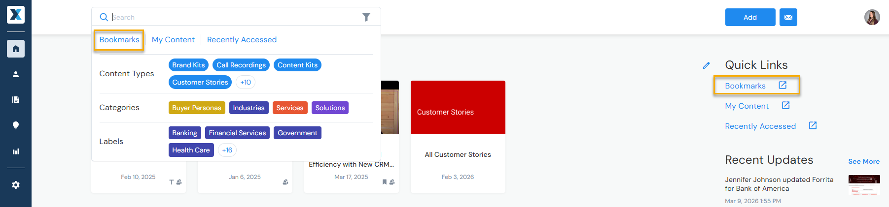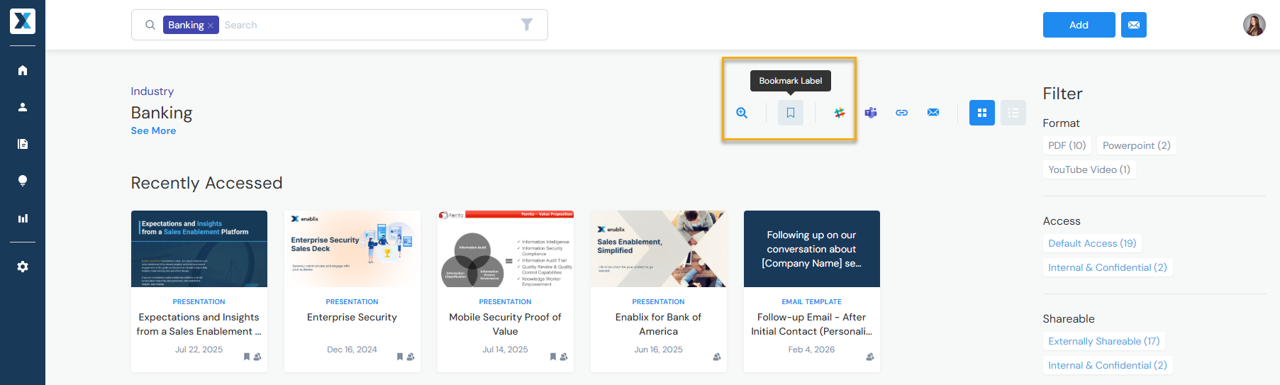 Access your bookmarks from extensions or from the Enablix homepage by clicking Bookmarks: