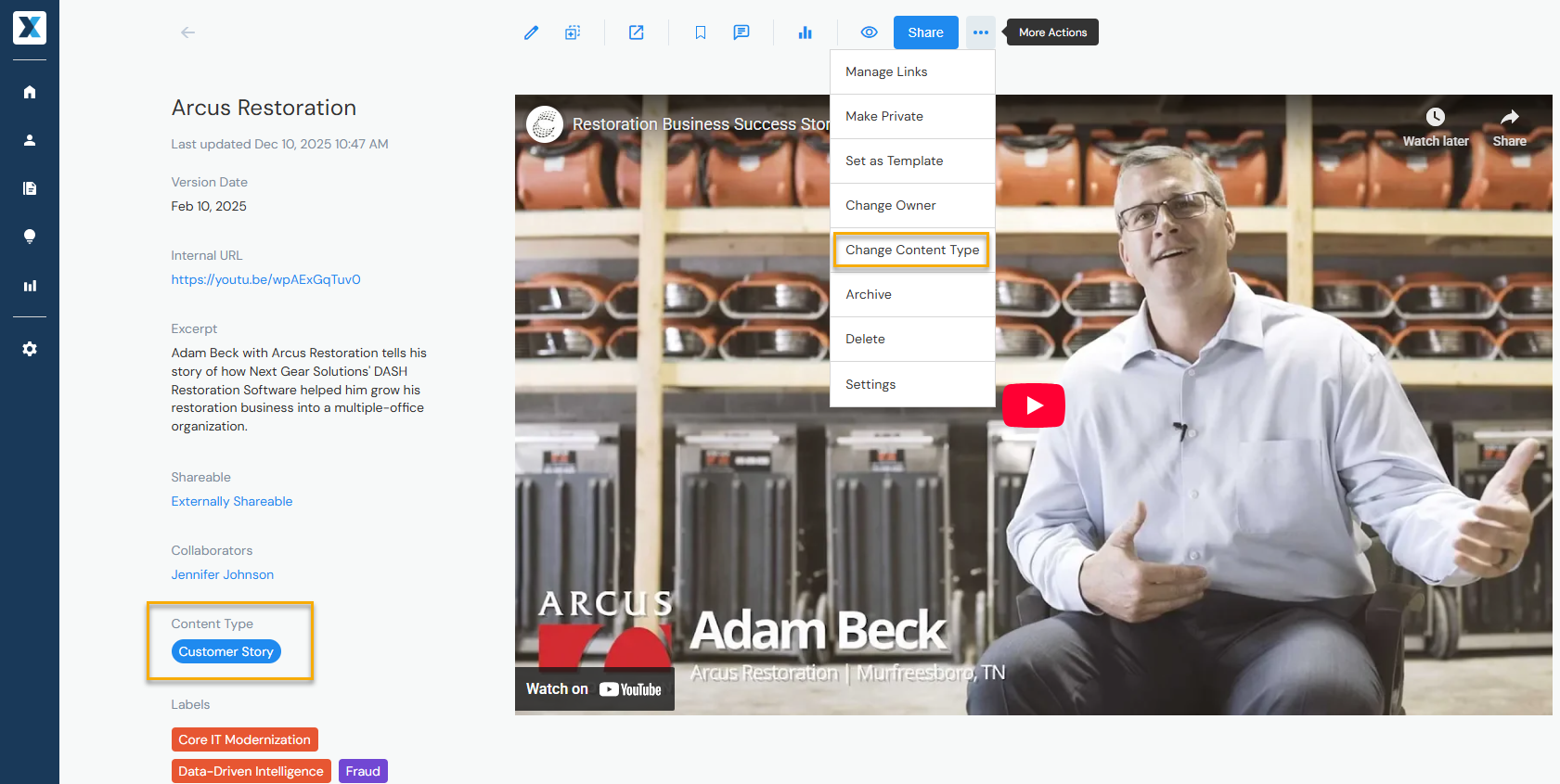To change a Content Type, open the asset, hover over the three dots to the right of Share and select Change Content Type: