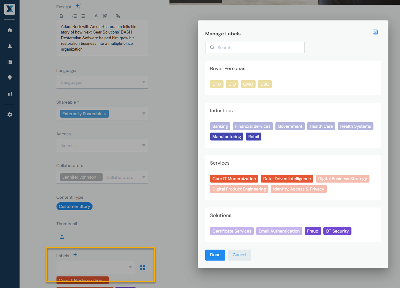 Organize your content by industry, solution, service, and more. You can add or remove Labels when adding or editing content. While adding Labels is not required, it's recommended: