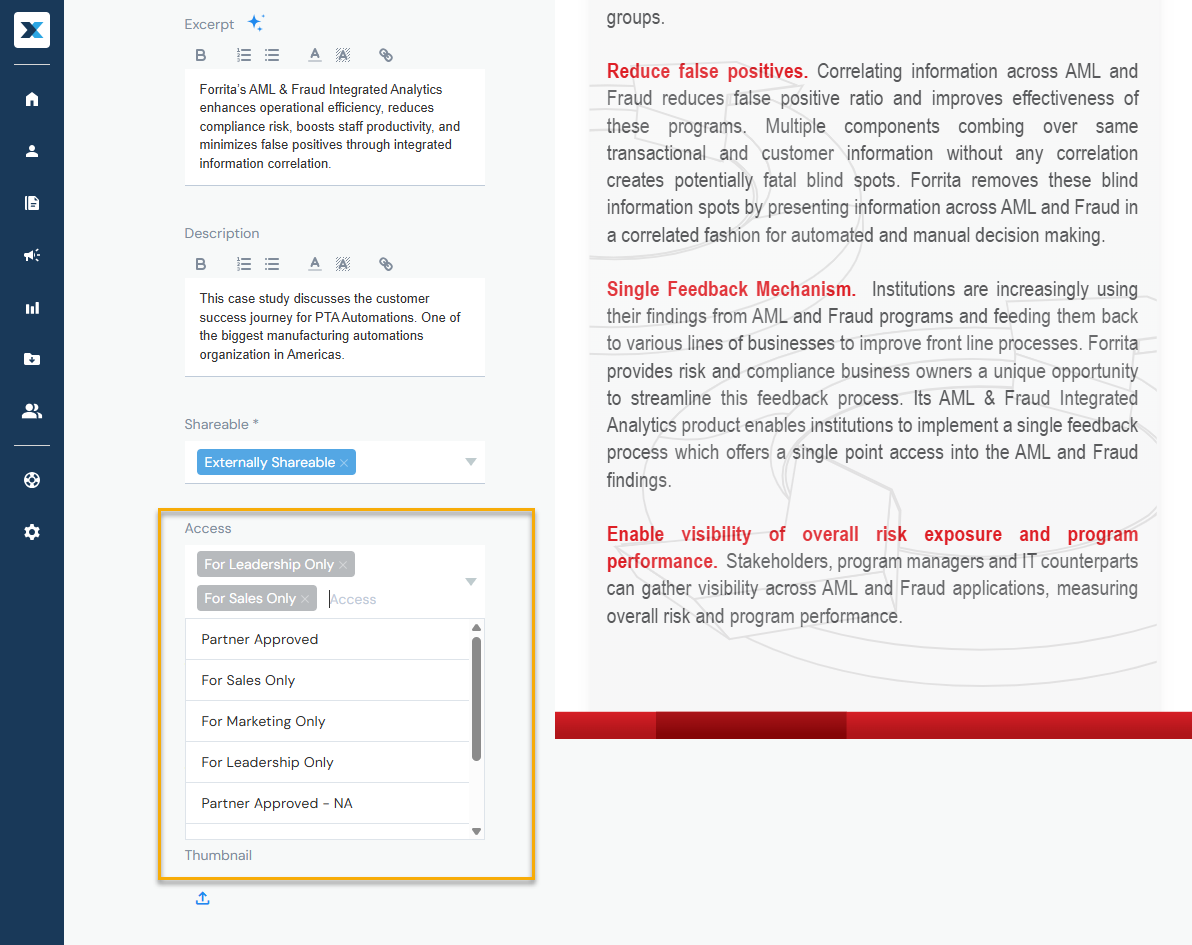 When you add content by Publishing it, it's available to all Enablix users. To limit it to select user groups—such as administrators or sales—you will still Publish it but select applicable Access Groups: