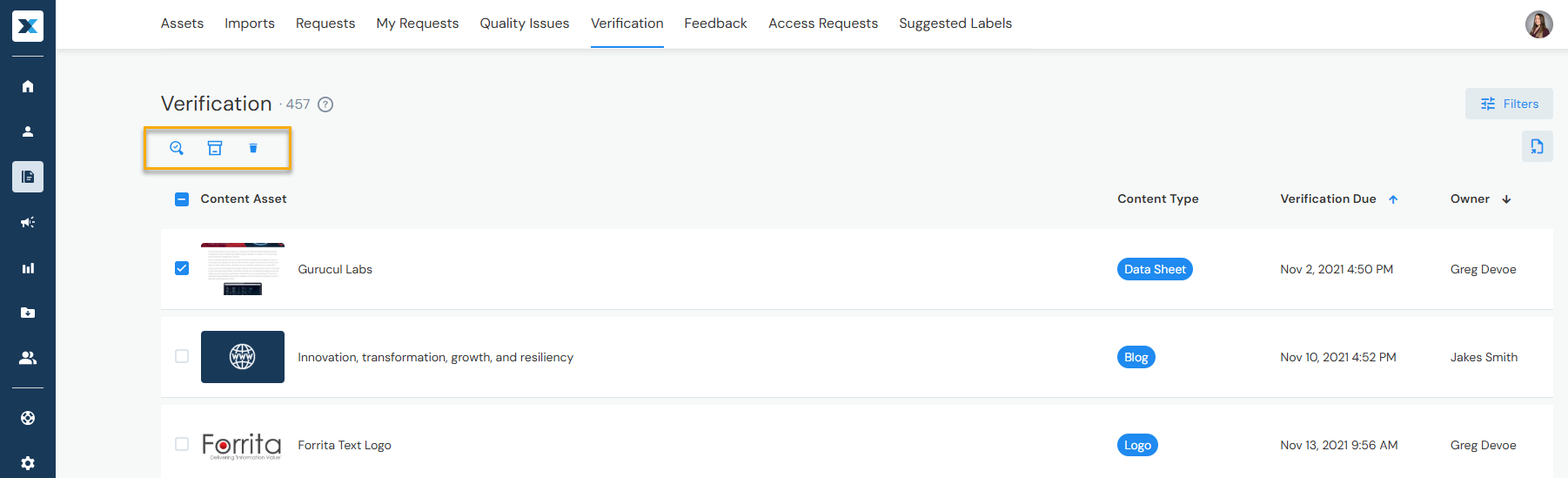 Have time-sensitive content? The default verification period is one year, but admins can adjust it by content type to as little as 30 days. To adjust it, admins can navigate to Company Settings > Content Types > [select Content Type] > Verify in Days: