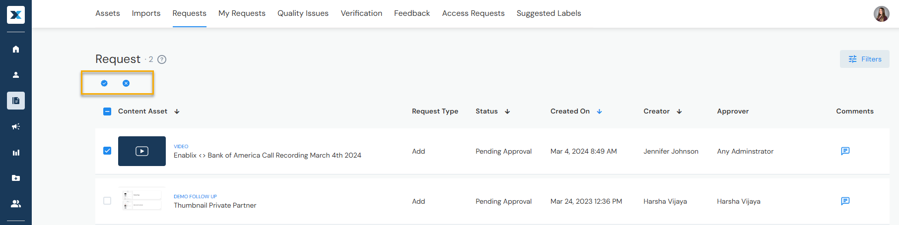If users add or edit content saving as Request Approval, Admins review requests here. Approve or reject requests — option to edit the request or content before making your decision: