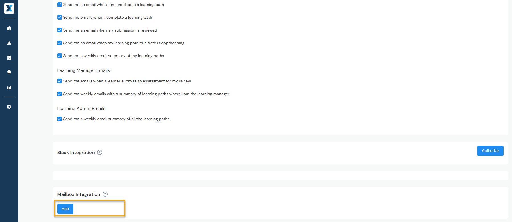 At the bottom of the page, click Add and select your email provider (Gmail or Microsoft). Follow the prompts to complete the integration: