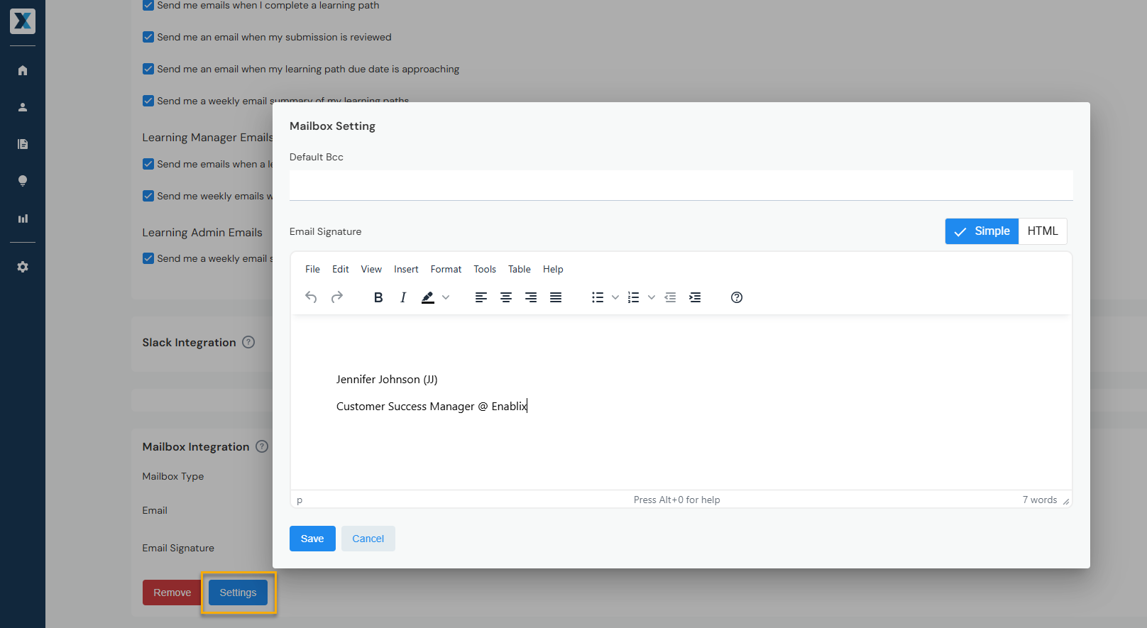 Once your email is integrated, click Settings to add your email signature: