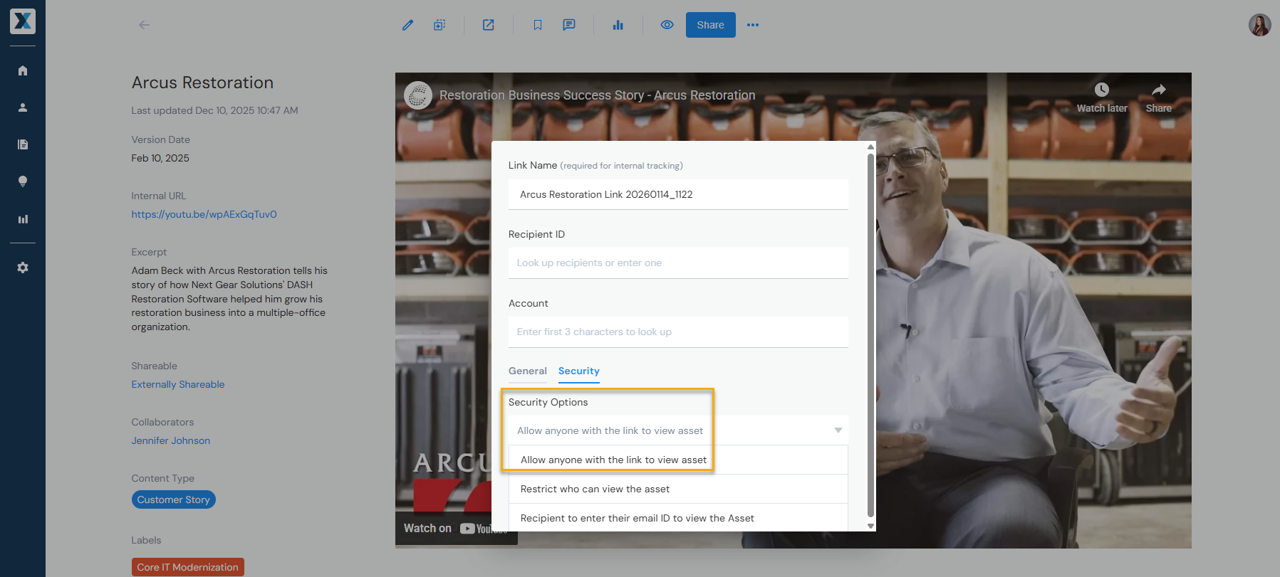 Restrict who can view content or ask recipient to enter their email to view the content. Depending on how you're sharing the content, click More or Customize Link to access the Security tab. In the dropdown select from the following: