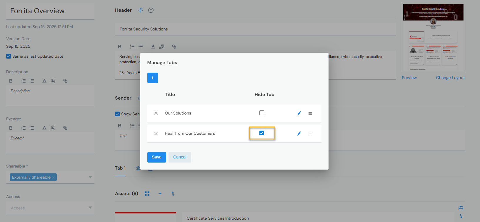 Tabs can be hidden or shown at any time. When hidden, a tab remains visible to you during editing but won't appear in preview or to recipients:
