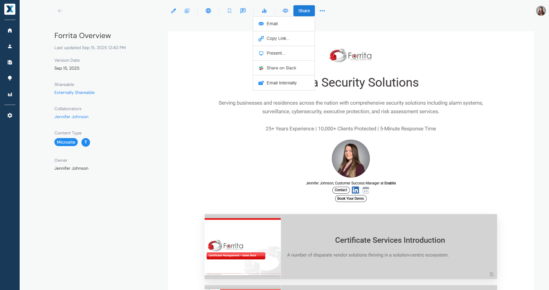 A Microsite is shared like any other content in Enablix—from the platform, extensions, or integrations. Check out all the ways to share content.