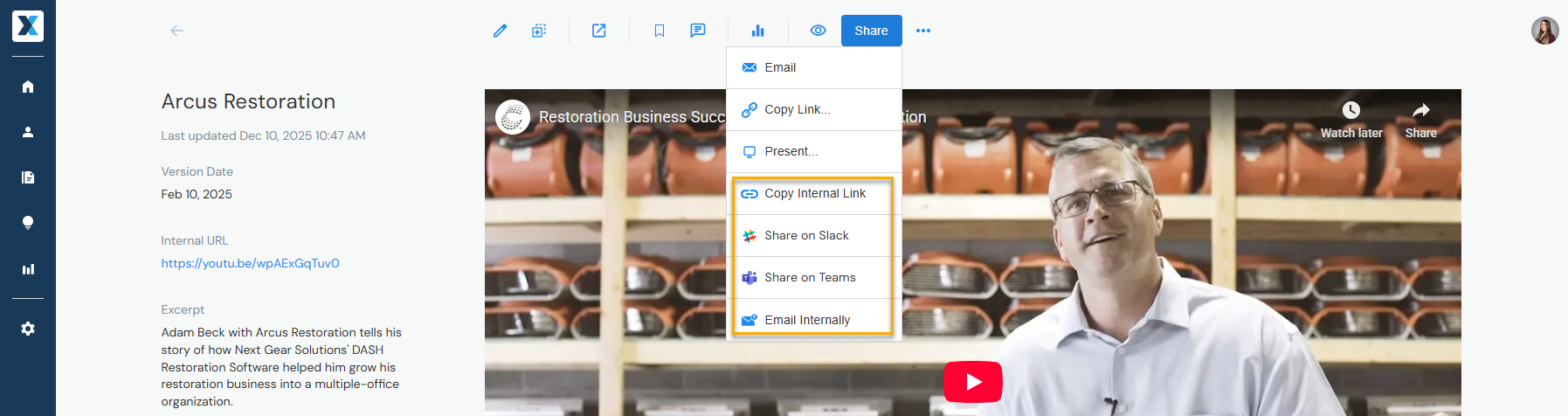 Open the content you want to share and click Share > Email Internally.