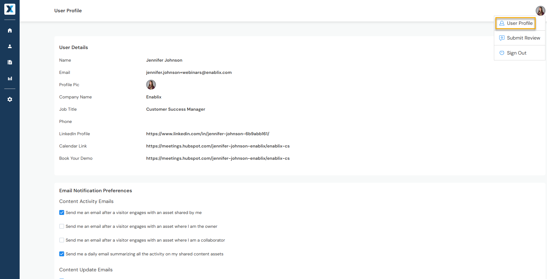 - User details Profile picture and contract info (visible to external recipients if sharing Microsites and Engagement Hubs)