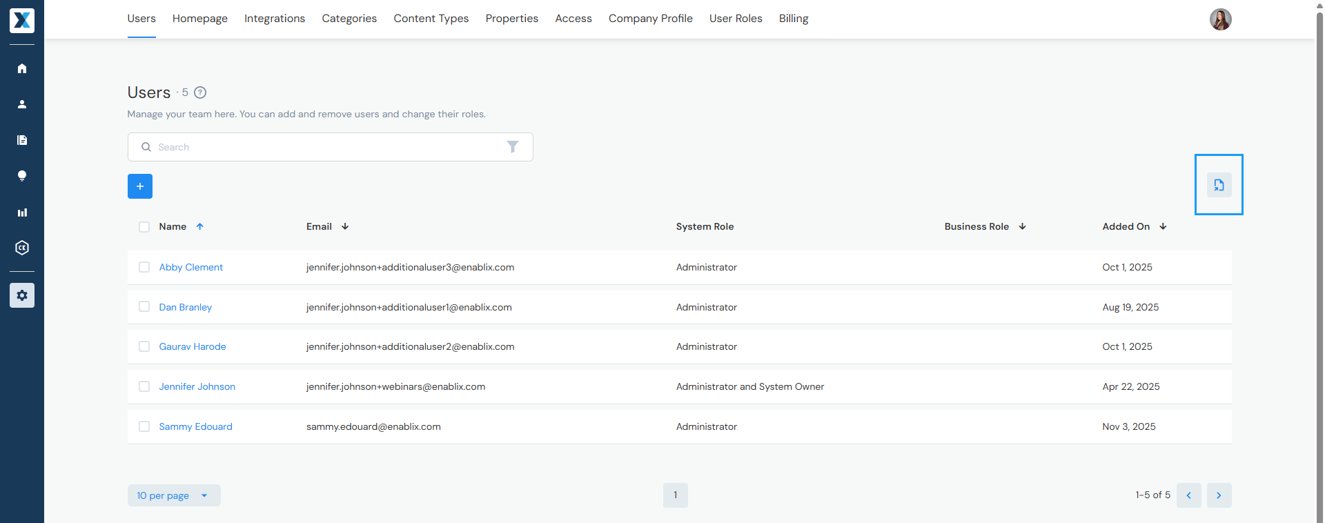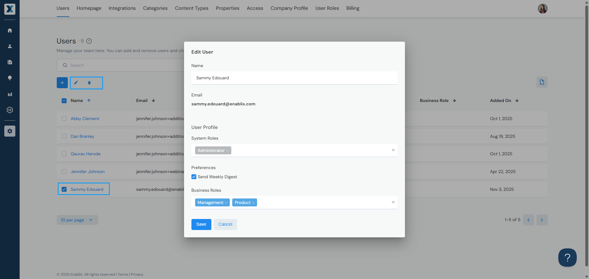 Need to change a user's email? Email addresses cannot be updated directly — reach out to us at help@enablix.com and we'll take care of it.