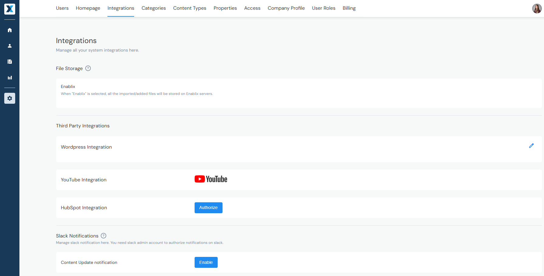 Important After you add or authorize an integration, contact your Enablix Customer Success Manager to complete the setup. Adding or authorizing alone does not activate the integration.