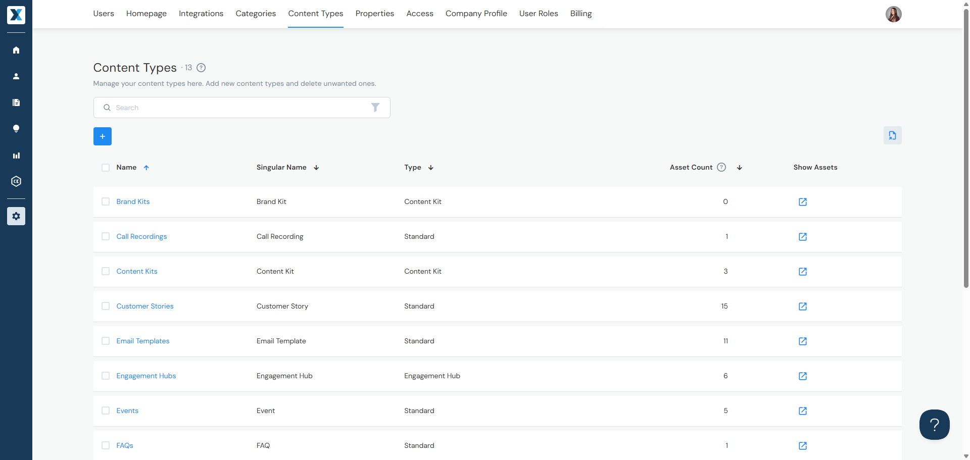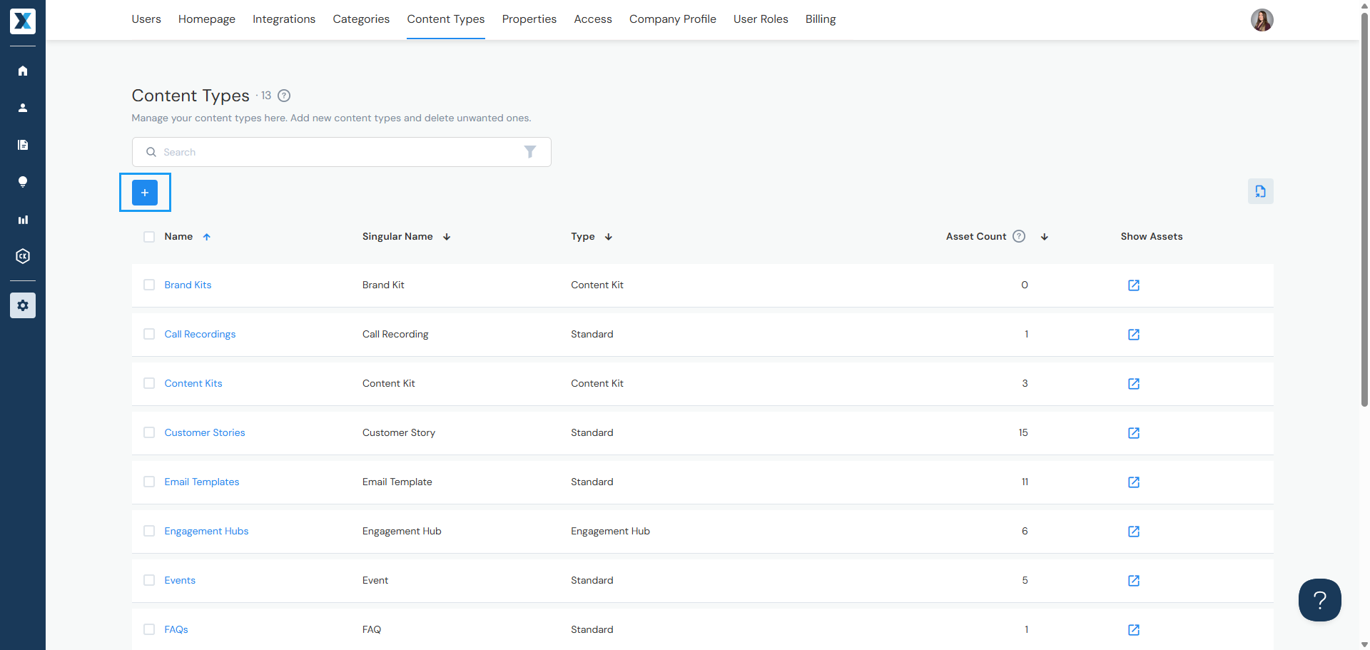 Content Types describe what a piece of content is — blog post, presentation, video, etc. Users are required to select a content type when adding content. Admins can add, edit, and delete Content Types in Company Settings > Content Types, including configuring what each type supports (e.g., files, URLs, email messages):