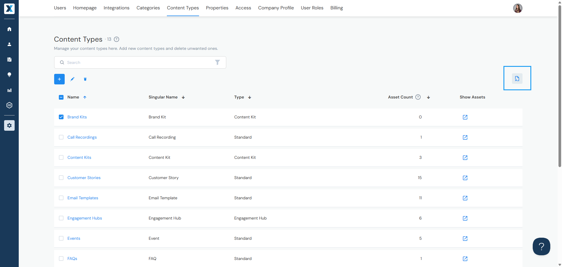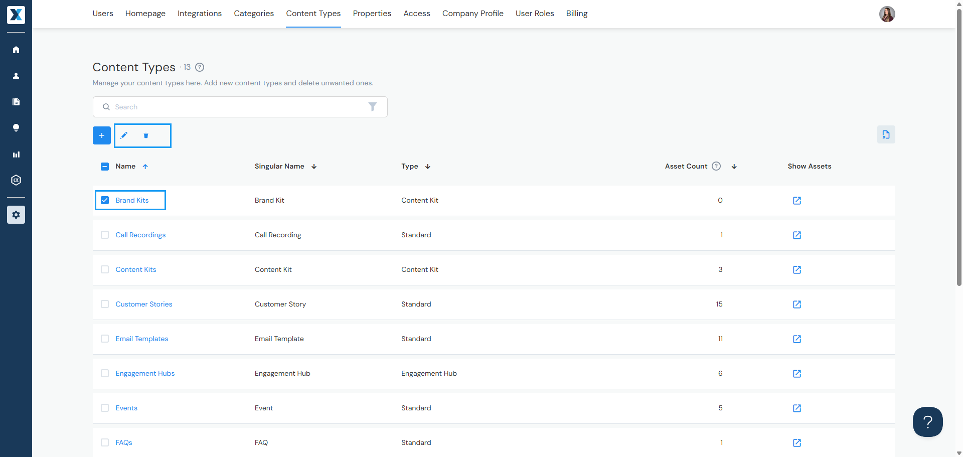 - By checkbox — Check the box to the left of the Content Type's name, then click the pencil icon to edit or the trash can icon to delete