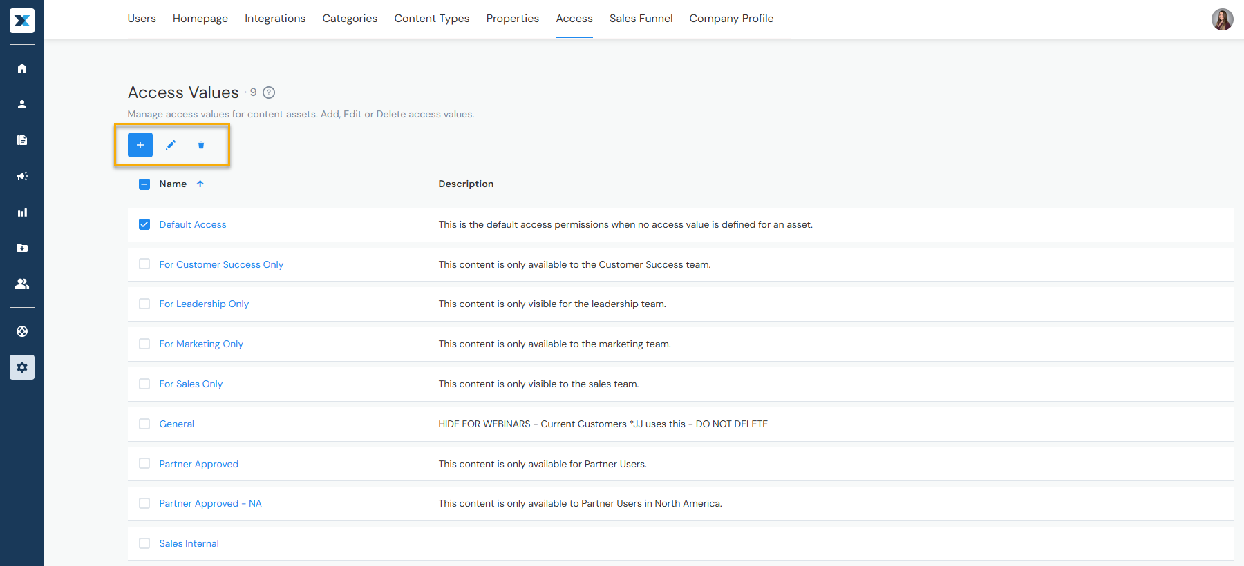 Published content is available to all users. Add access groups (such as admin only or approved for sales) to make it available to select user groups. Users can add and remove access groups when adding or editing content, while admins can add, edit, or delete the access groups here.