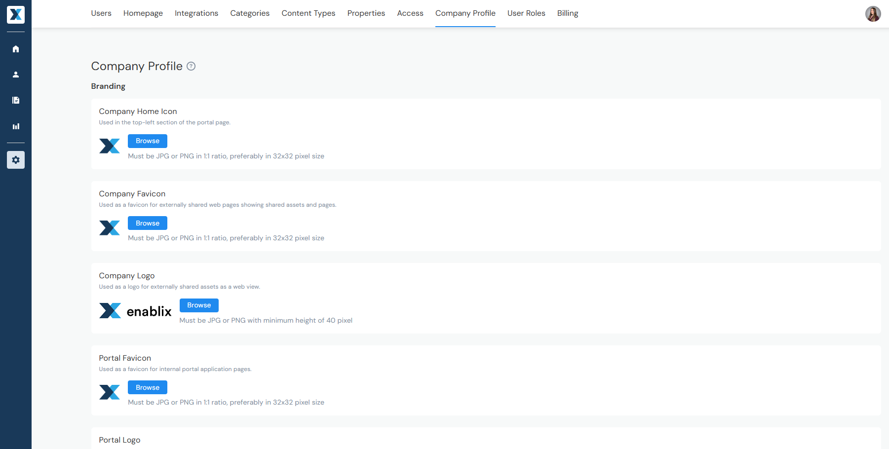 Manage your portal's branding. Depending on the icon, favicon, or logo, it can be seen internally or externally. Under each option there's a definition text letting you know where this is used.