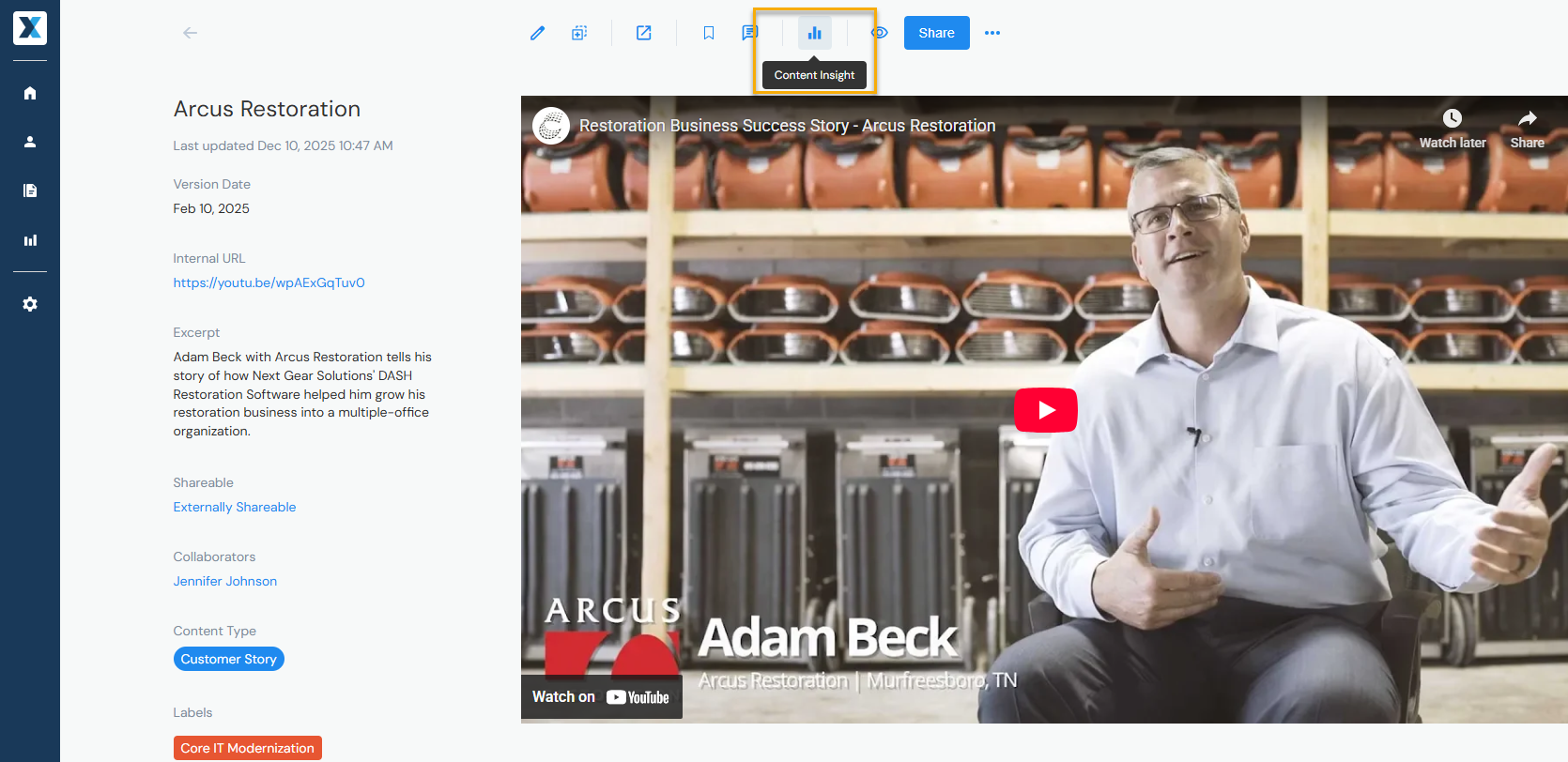 Individual content level reporting. Open any content and click Content Insight from the top toolbar to see it's overall performance and more: